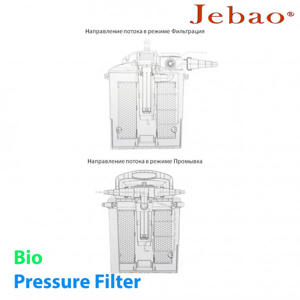 Вода від насоса під напором подається на вхід фільтра. Далі, вода проходить фільтрувальний мат і плаваючу біозавантаження. Перед виходом із фільтра вода додатково обробляється ультрафіолетовим випромінюванням. Система УФ входить до комплекту фільтра.